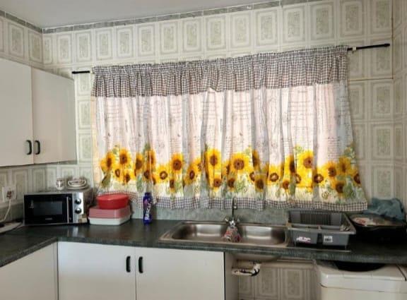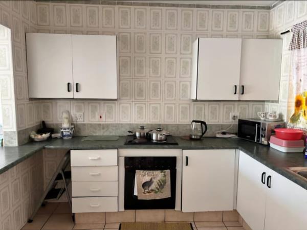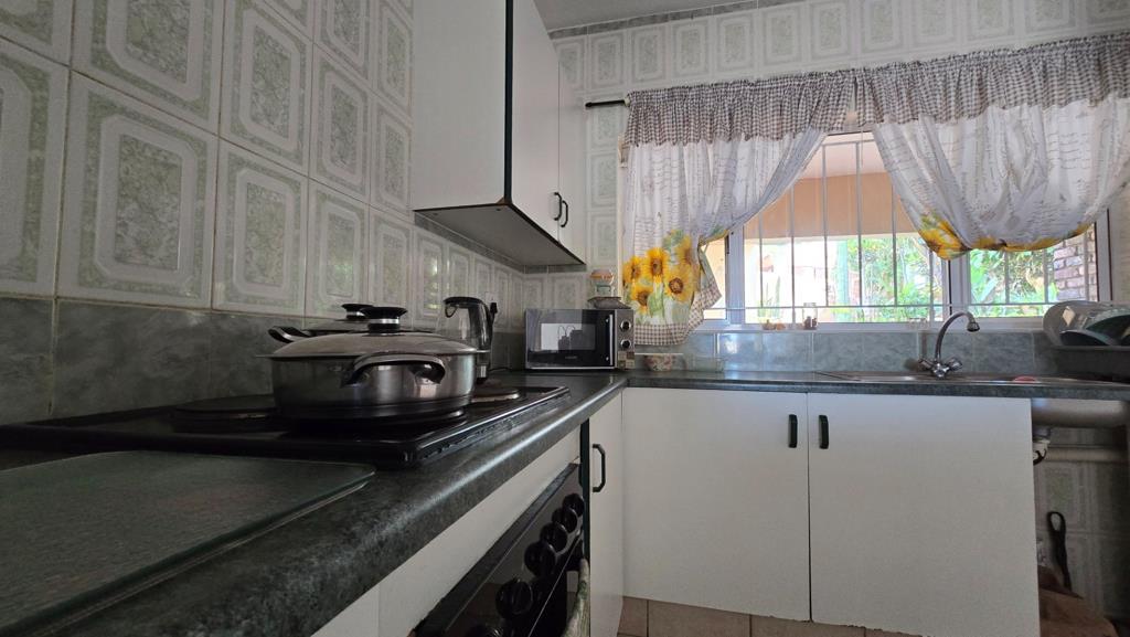 The well-designed kitchen features ample cupboard space, a convenient breakfast nook, and a stove with an under-cover oven. This open-plan kitchen design flows effortlessly into the combined lounge and dining area, creating a cohesive living space. An air conditioner in the living area ensures year-round comfort. The master bedroom offers a private sanctuary, complete with built-in cupboards and an en-suite bathroom featuring a toilet, basin, and shower. The second bedroom is also spacious and includes built-in cupboards. The main bathroom is fully tiled and well-appointed with a basin, toilet, bath, and hand shower.