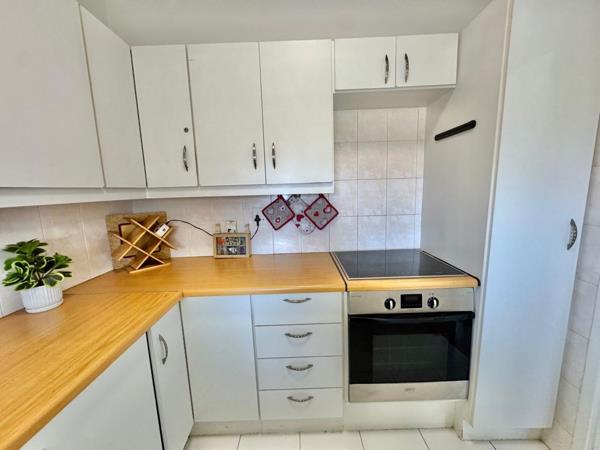 The kitchen has melamine counter tops with slick white built in cupboards.