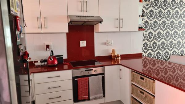 The kitchen is just heavenly! A red porcelain table top counter where you and your family will be cooking. State of the art built in stove, oven, a area where you can fit your washing machine or dishwasher and double fridge. Built in cupboards and a burglar guard to keep you and your family safe.