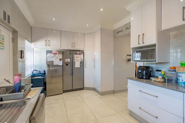 Step inside to an expansive open-plan living and dining area, bathed in natural light and adorned with sleek tiled flooring and recessed lighting, creating an inviting ambiance for both relaxation and entertaining. The heart of this home is its state-of-the-art kitchen, boasting pristine white high-gloss cabinetry, elegant stone countertops, and a suite of integrated stainless steel appliances, including an oven, hob, extractor fan, and dishwasher. This culinary haven offers abundant storage and seamlessly connects to the main living spaces, fostering an effortless flow.