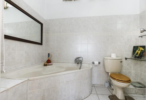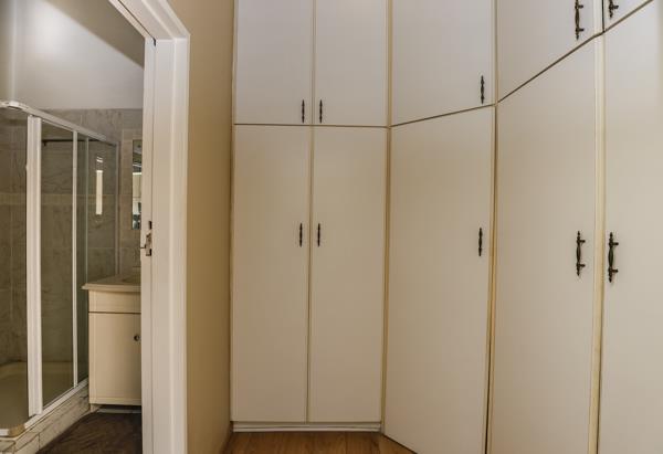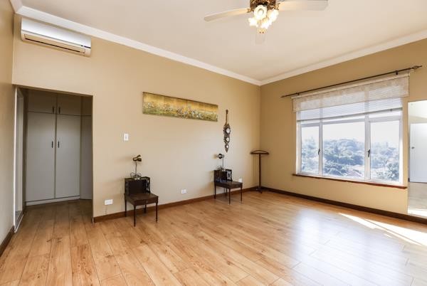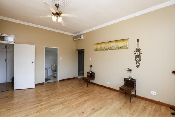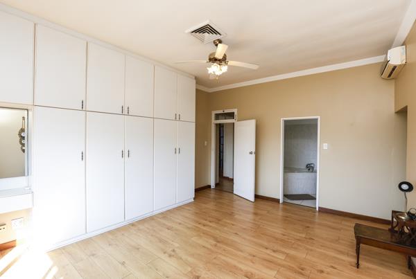 Grand main bedroom with dual en-suite bathrooms (bath + shower), walk-in wardrobe, built-in cupboards & air-conditioning