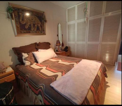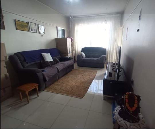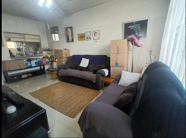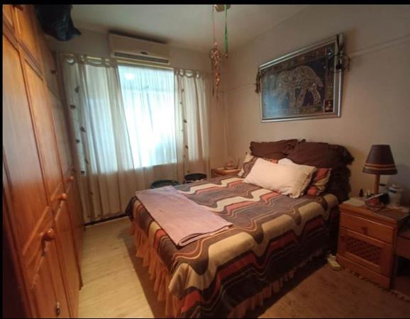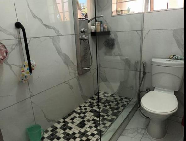 The main bedroom is generously proportioned with built-in cupboards and a ceiling fan, while the half bedroom, also fitted with cupboards, is ideal as a study or additional storage. The modern bathroom is tastefully tiled and features a shower, basin, and toilet.