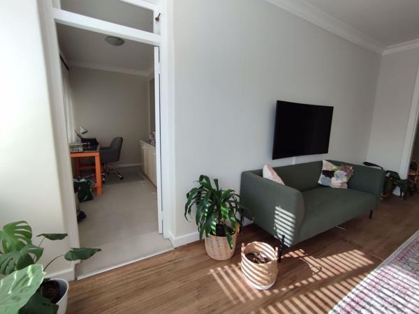 Great sized bedroom, with adjoining space for a home office. Separate loo and bathroom. Fitted kitchen with washing machine and dishwasher connection. A beautifully bright open plan lounge and dining area, with side sea views.
