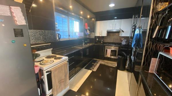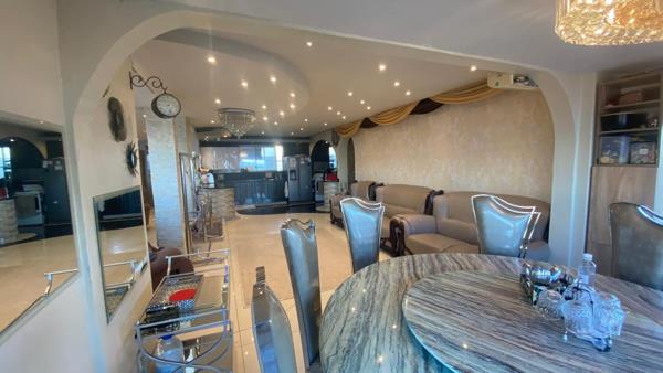 Step into a bright and spacious open-plan lounge and dining area, beautifully tiled and illuminated by designer chandeliers. The seamless flow leads into a sleek, ultra-modern gourmet kitchen featuring granite countertops, an eye-level oven, built-in hob, and ample custom cabinetry a dream for any entertainer.