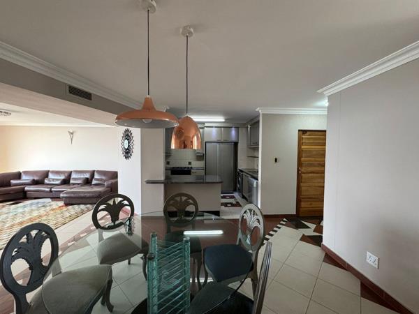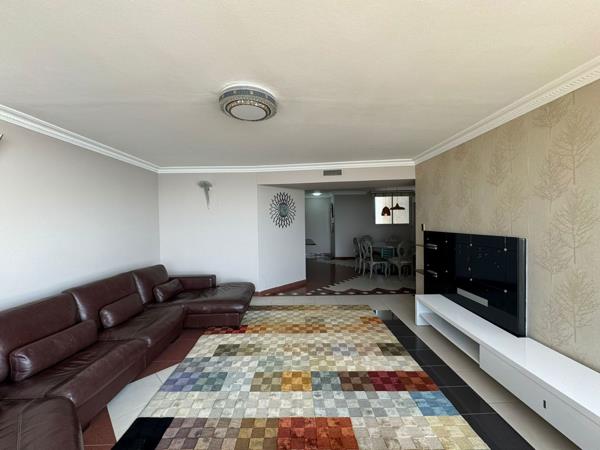 Sea views galore in North Beach. Pam Golding Properties proudly presents the finest block on Durban''s Golden Mile. You will be amazed at the beautiful view that greets you as you enter this stunning three bedroom, two and half bathroom apartment. Just right o f the entrance walk into a spacious open plan dining area with an eight-seater dining table and a fully fitted kitchen with granite tops, fridge, microwave, and stove with Eye level oven and extractor fan. From the dining area, step into the relaxing lounge with a beautiful lounge suite and includes TV and cabinet, where you can sit back and enjoy and be mesmerized with the incredible ocean view.