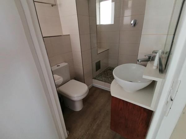 One bedroom with built in cupboards and 2 bathrooms, tiled flooring
