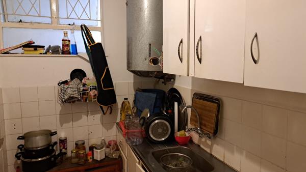 Ceramic tiles, original bedroom cupboards and fitted kitchen.