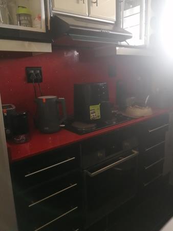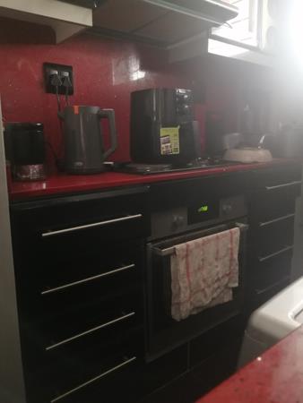 - Spacious kitchen with granite countertops, double sink, undercounter oven, hob, and built-in cupboards