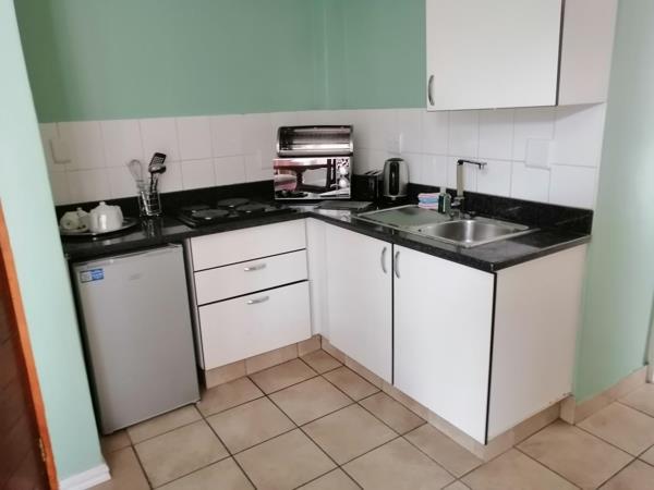 One bedroom with built in cupboards and 2 bathrooms, tiled flooring