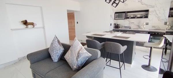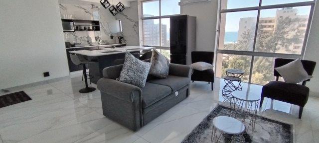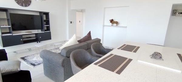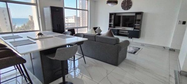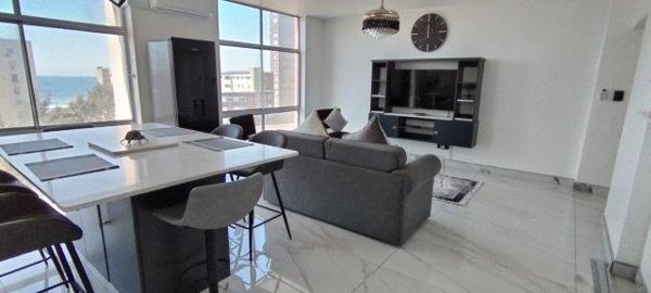 Spacious lounge with flowing porcelain tiles throughout the flat and stunning seaviews