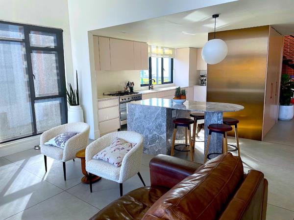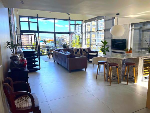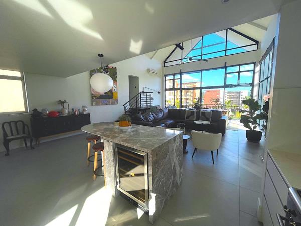 This spacious, airy 4 bedroom, 3,5 bathroom (2 en-suite) penthouse apartment, includes a double-volume, open-plan, designer kitchen, which opens into the spacious lounge and dining room, which has large glass sliding doors, which open out onto the veranda and the stunning canal and palm tree views all the way to Timeball Square.