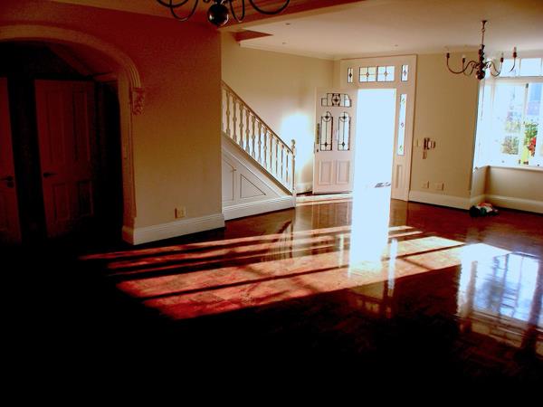 The charming, spacious open-plan entrance hall cum double lounge area, has a beautiful set of bay windows, as well as it''s own separate store room / washing room area, plus a charming guest toilet, positioned under the stairs.