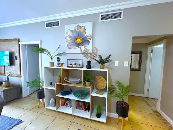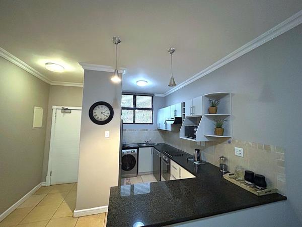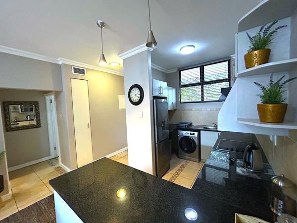 The second bedroom which is a fair size, has also been stylishly redecorated and includes two single beds and built-in cupboards. The bathroom, which is across the passage from the bedroom, offers a glass fronted shower, as single oval basin and a toilet.