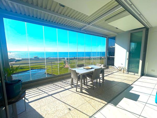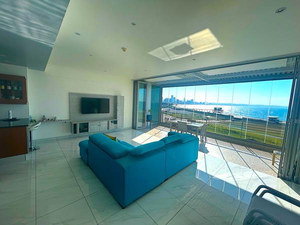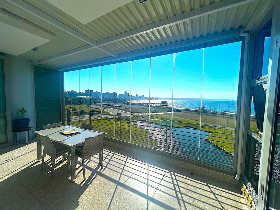 onto a large balcony, which in turn, also has it own set of concertina, sliding glass, doors. This allows one to open the internal concertina doors and benefit from the spaciousness that the internal areas and the patio affords one. This wonderful enclosed veranda area, offers spectacular beach and ocean views, from the beachfront Watersports clubs, all the way up the coats to past Umhlanga.