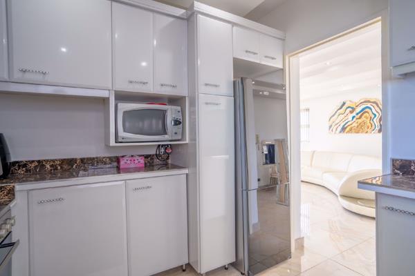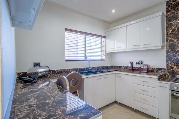 A seperate kitchen with marble counter tops which adds a sense of sophistication. Ample built in cupboards, with a double stainless steel sink. There is a seperate storeroom within the unit which is plumbed for your washing machine and dish washer making this a great convenience.