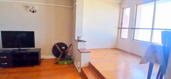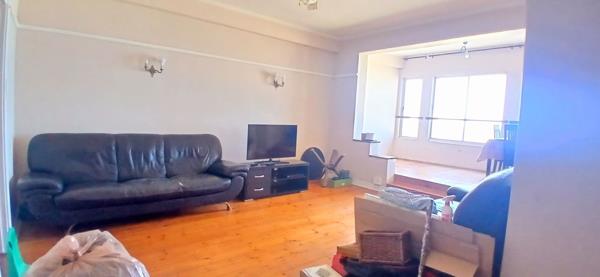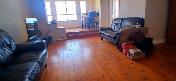 Open plan dining room and lounge area with wooden floors. Stunning sea views in the lounge and bedroom. The kitchen has fully fitted cupboards with sea views and is tiled.