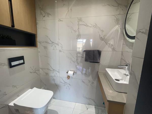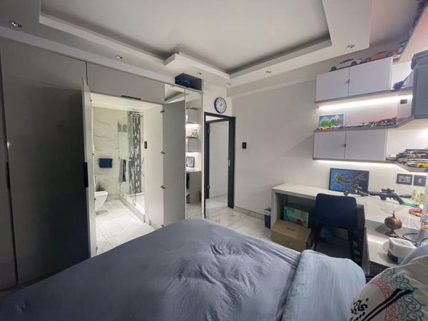 Think vacation 365 days of the year. The three en-suite bedrooms are designed to feel like hotel rooms with USB charging ports on either side of the bed, side lights with switches next to the bed and Quartz stone on side pedestals. All rooms come with custom fitted electric curtain rails and custom fitted blinds. All bathrooms boast custom made mirrors with LED Lighting. There is also a separate guest toilet and basin. Fully airconditioned. Fibre connection throughout the home with wired connection to TVs and study areas in all rooms. Custom Fitted Palace sliding door. Tinted windows. This Apartment is ideal, lock up and go with 24-hour guard at reception and 24-hour guard street parking. The Apartment comes with 1 Sectional Title parking Bay. Additional parking can be rented for R600 per month.