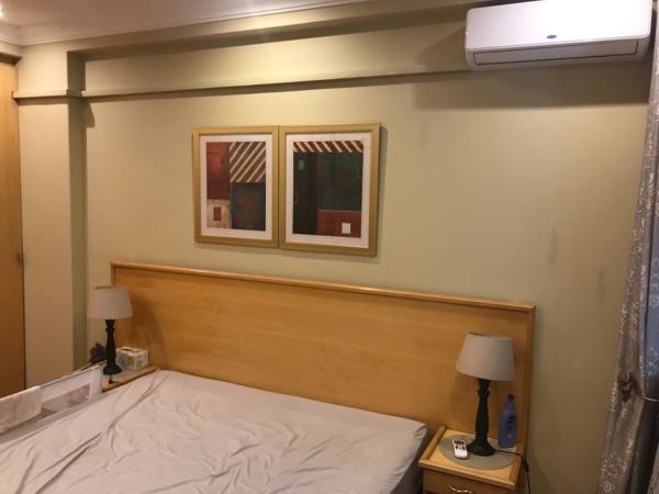 The main bedroom is spacious with generous wood mirror, built-in cupboards, air-conditioning with en-suite bathroom. Guest bathroom with basin and toilet.