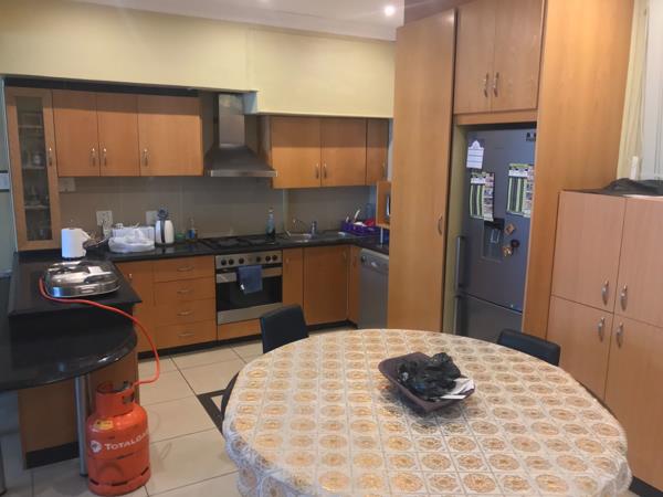 Modern large open plan kitchen with space for dining table, granite counter with ample cupboards and wood finishes which leads onto a living area with air-condition, plenty of natural light and airflow.