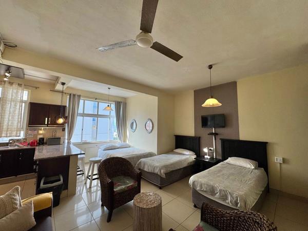 The bedroom is fit for a queen bed and has built in cupboards. Enjoy the cool sea breeze with a ceiling fan in the open plan lounge and dining area with stunning side sea views that will take your breath away. The aluminum windows add a touch of modern luxury to the apartment.