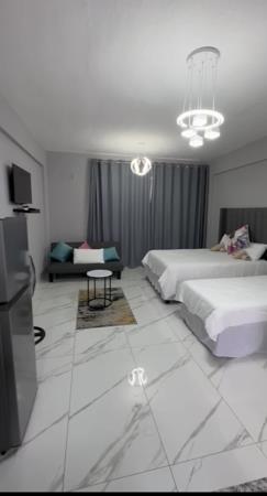 Layout: Open plan studio with 2 x beds, and dedicated work corner and Dinner set