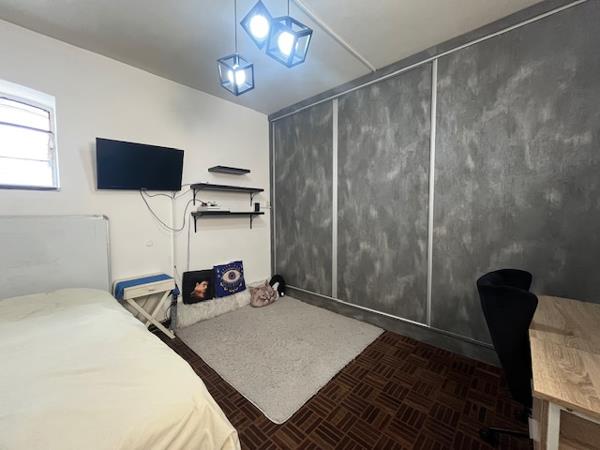 The main bedroom has ample storage with built-in cupboards, ensuring a clutter-free space.