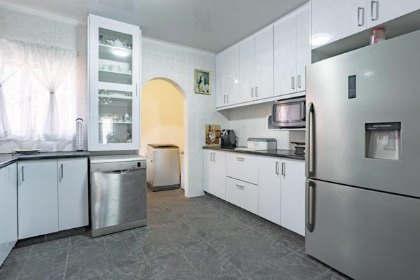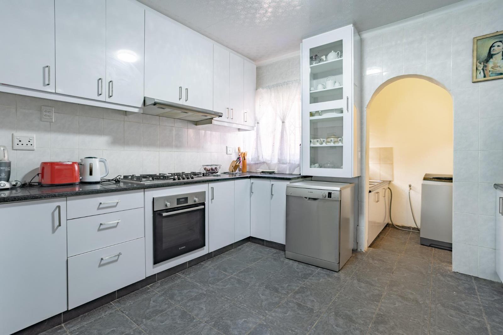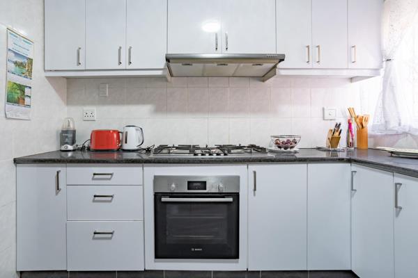 As you step inside, you are greeted by a fully tiled interior with high ceilings and an open-plan living and dining area that flows seamlessly into the kitchen. The kitchen is well-appointed with ample built-in cupboard space, granite countertops, a double sink, a gas stove and hob, and an extractor fan. This setup not only ensures a healthier environment by expelling stale and humid air but also helps regulate temperature.