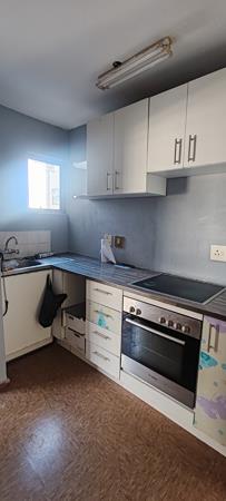THE KITCHEN IS FULLY FITTED WITH BUILT IN CUPBOARDS,A STOVE AND AN OVEN.