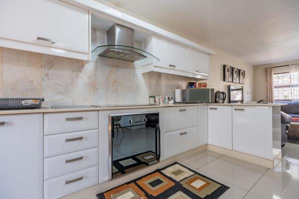 Enter through an electric gate into a neatly covered, spacious courtyard that doubles as a laundry room with ample storage, leading to an open-plan interior layout. The modern kitchen boasts quartz countertops, a touch-control hob, oven, and extractor fan, flowing into a spacious dining area perfect for family gatherings. The light, bright lounge opens onto a back patio, offering a versatile space for braais, sundowners, family game nights, or a child-friendly play area where you can watch the kids from the comfort of your home.