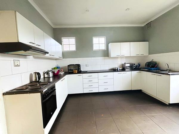 The dining room and lounge have been converted into additional bedrooms but can easily be restored to their original purpose. The kitchen is equipped with built-in cupboards, while the main bathroom includes a bath, basin, toilet, and extra storage cupboards. There is also a separate toilet for added convenience.
