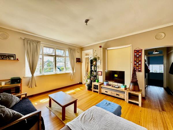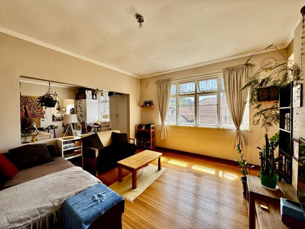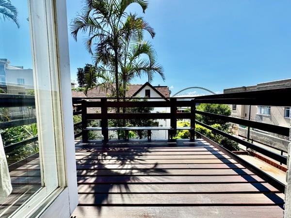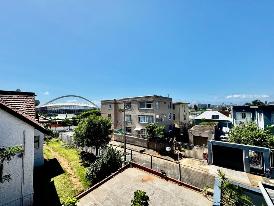 The flat includes a separate bedroom, lounge, dining room, kitchen, and bathroom, with a deck that boasts stunning views of Moses Mabhida Stadium and the city. Situated in a small, quiet block with only four units on a peaceful road, the property features pristine wooden floors and high-volume ceilings, adding charm and character.