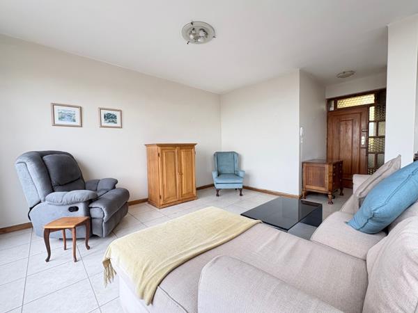 The main bedroom includes built-in cupboards, and an en-suite bathroom with a bath, basin, and toilet. The second bedroom offers built-in cupboards, while the family bathroom has a shower, basin, and toilet. A cupboard in the bathroom discreetly hides the washing machine and geyser. A linen cupboard in the passage adds extra convenience.