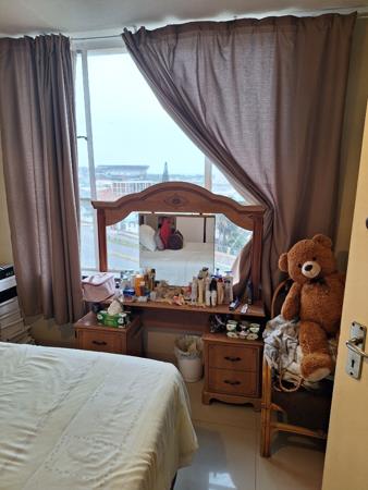 Very neat 1.5 bedroom top floor flat with lovely views of Moses Mabhida Stadium. Open plan Kitchen , dining and living area flows to the enclosed and private porch used as a bedroom. Large main bedroom with en suite with bath, basin and toilet. Lots of built in cupboards. One open bay parking. Well maintained block close to Windermere Centre.