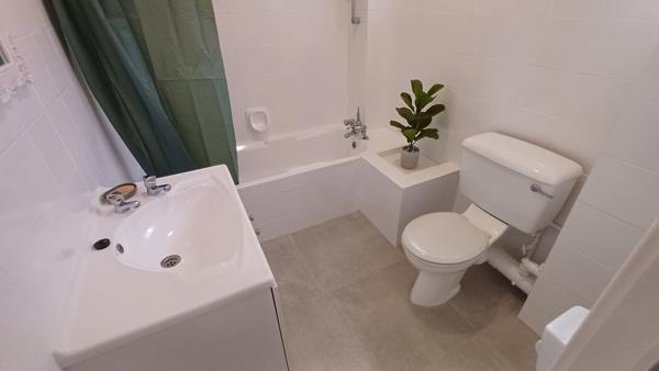 The bathroom is clean and functional with a bath, basin, and toilet. A major highlight is the beautifully maintained communal garden perfect for relaxing or entertaining outdoors. The unit includes one open bay parking space and offers easy ground-floor access.