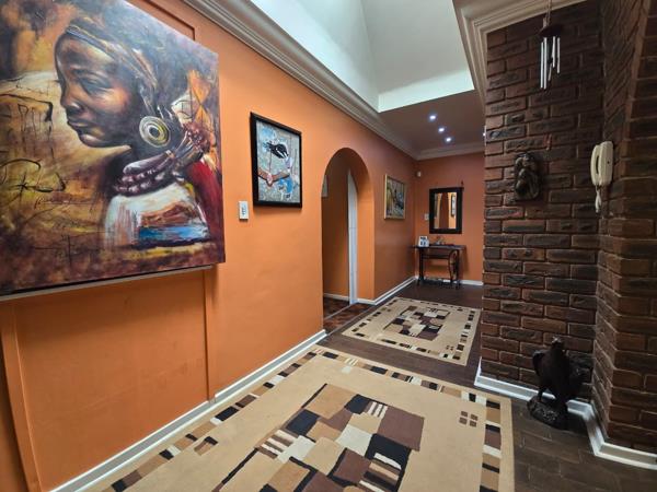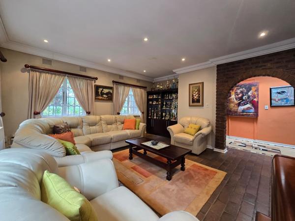 Inside, discover an interior designed for comfortable living and entertaining. The home features an open-plan layout, two lounges, a dining room, and a family TV room. Architectural character is evident with high ceilings, crown molding, recessed lighting, and unique exposed brick archways and feature walls. A well-appointed kitchen and dedicated braai room enhance entertainment possibilities.