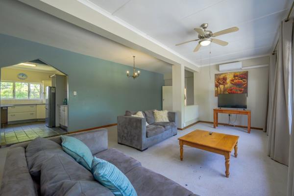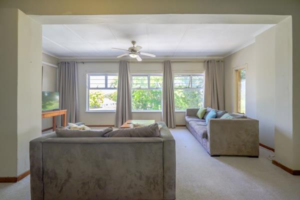Section 1 on the ground floor is 215sqm and offers a spacious dining room with stack back doors to a large undercover patio overlooking the garden, braai area and an inviting swimming pool. A bar area + lounge leads to the fitted kitchen with ample cupboard space, plumbed for a washing machine + dishwasher.