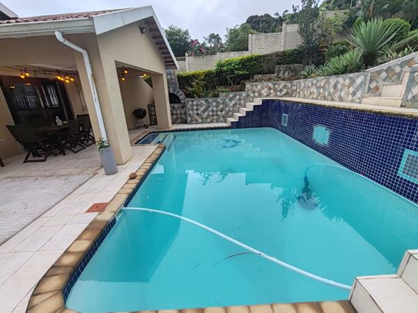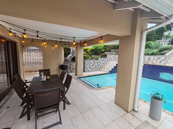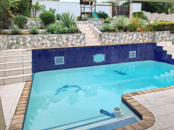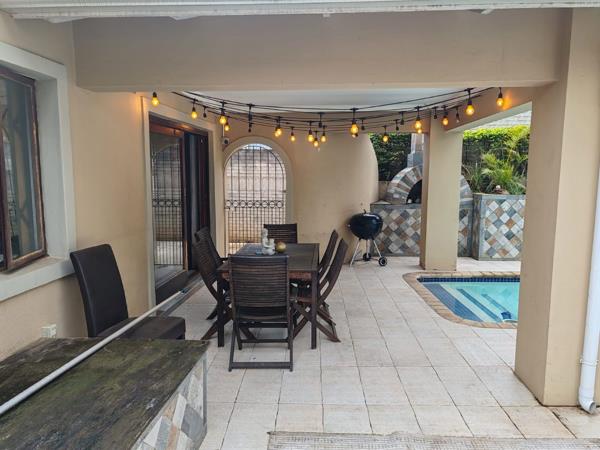 Stunning Family Home With Income Generating Salon. Situated in prime upper Glen Anil this single storey home has been modernised with high end finishes. Tiled throughout in neutral tones the lounge with fitted entertainment unit and automated drapes opens onto a fabulous undercover patio with braai area, sparkling pool and dedicated play area with jungle gym for the children. A stylish dining room integrates with a Caesar stone kitchen with double oven and gas hob.