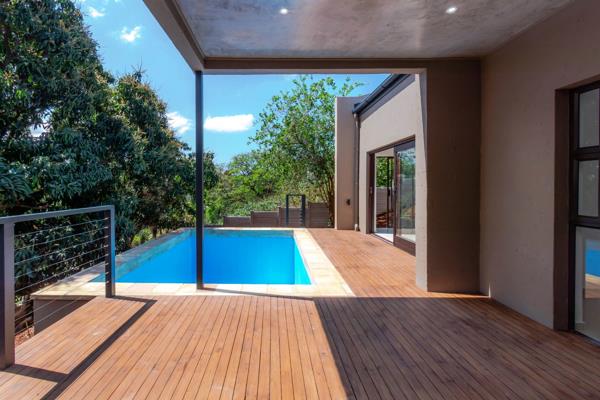 Entrance to an open-plan living area with plenty of light and air. The fitted kitchen with granite kitchen counters and unique porcelain tile splash-backs are the focus of the open-plan kitchen area. The kitchen is fitted with an AEG glass hob and under counter oven and extractor fan. This dining area has space for a family breakfast area overlooking the garden as well as a formal dining area for guests. The raked ceiling provides an expanse of space and height that gives the living room extra volume. A comfortable informal living room opens up to a pool deck and sparkling deep blue pool and garden.