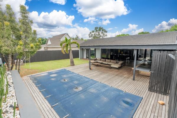 Beautiful pool that offers a safe covering option for the little ones draping to a grassy garden for family fun