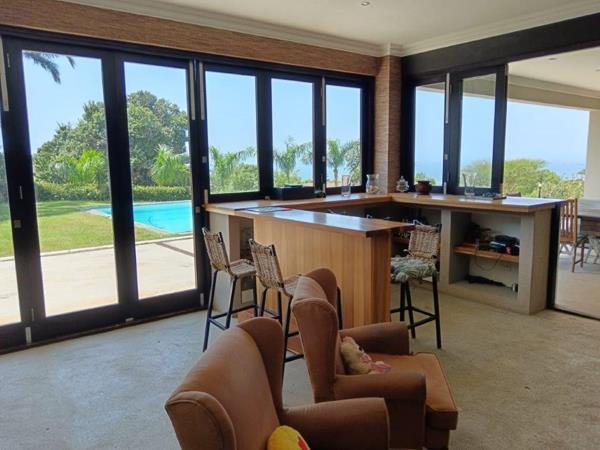 The Double Volume Entrance hall with cheery fireplace, reflects the friendly spirit of this home. The open plan spaces throughout the diningliving areas give one that no hemmed in feeling allowing plenty of room for Big Comfortable Chairs and Sofas. The Built-in Bar, with surround sliding windows ,is perfect for Brunch with a few friends ,looks out over the Patios ,rim-flow Pool, large Grounds and leads out to the expansive All- Weather Entertainment PatioVerandah, with views over the Large Gardens, the village Green and impressive Sea Views. The perfect place for family gatherings, while keeping an eye on the little ones having fun in the pool gardens. OR just a Sun-downer for TWO.