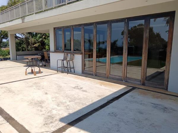 The bedroom wing consists of A COZY TV LOUNGE, 4 x spacious bedrooms, all with Full, en-suite bathrooms, tub, shower, vanity and w.c. NB 4th bedroom to be completed sanitary ware tub, cupboards ,on-sitewith ample cupboard space and storage shelves. Bedroom No 1, with stack back shutters opening onto a verandah, overlooking the pool and groundsgardens. The 4th private, large, first floor master suit with walk-in dressing area, study area with stack back shutters ,has views over the downstairs entrance hall. An easy flow through A Study Living area, bedroom with stack-back doors all round, opening out to the Upstairs all- weather View Patio, Built -in braai pizza oven and the amazing UNOBSTRUCTED SEA VIEWS, MAKES FOR THE IDEAL SUN-DOWNER RETREAT After a Hard day at the Office. OR invite the FriendsFamily to join you and enjoy the Stunning Views.