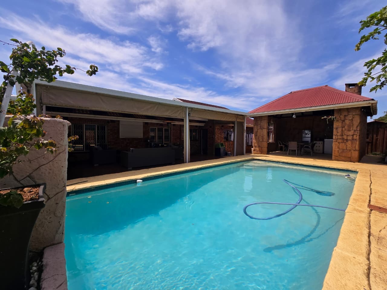 Outdoor living is a true highlight, featuring a large, inviting swimming pool perfect for relaxation. A covered patio provides an ideal spot for outdoor lounging, while a dedicated braai room and entertainment area, complete with an outdoor kitchen setup, promise memorable gatherings. The property also benefits from a deck, a well-maintained garden, and extensive paving leading to two garages and a remarkable ten parking spaces.