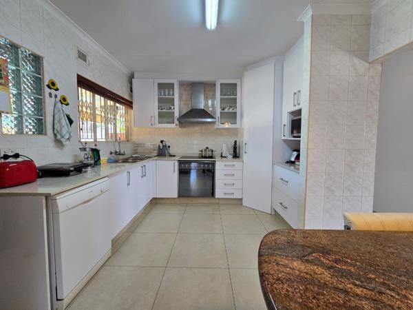 Located in the suburban heart of Greenwood Park, Durban, this expansive residential property offers a remarkable 1680 sqm of floor space, designed for comfortable family living and versatile accommodation. The main residence features generous open-plan living and dining areas, bathed in natural light from large windows. These spaces boast practical tiled flooring, recessed lighting, and climate control options including ceiling fans and visible air conditioning units, ensuring year-round comfort. The modern kitchen showcases white cabinetry, granite countertops, and integrated appliances, complemented by a second kitchen on the property, highlighting its dual living potential.