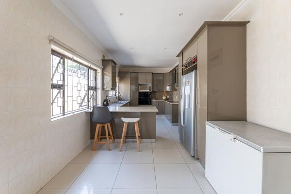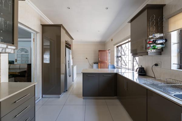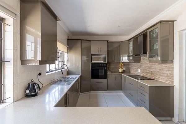 Kitchen: A large kitchen with modern cupboards that flows seamlessly into a cozy dining area, ideal for family meals and gatherings.