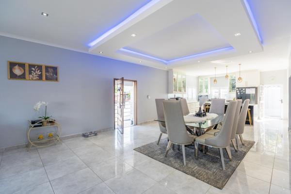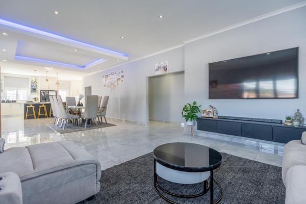 Security is top-tier, with an electric fence, alarm system, and surveillance cameras ensuring complete peace of mind. Step inside and be welcomed by a large, open-plan kitchen that perfectly blends modern style with everyday functionality. Thoughtfully designed for culinary enthusiasts, it features a central island with a gas hob, generous storage space, a separate scullery, and a dedicated laundry area for added convenience. The kitchen flows effortlessly into the dining area and lounge, making it easy to serve meals and stay connected with guests while cooking.