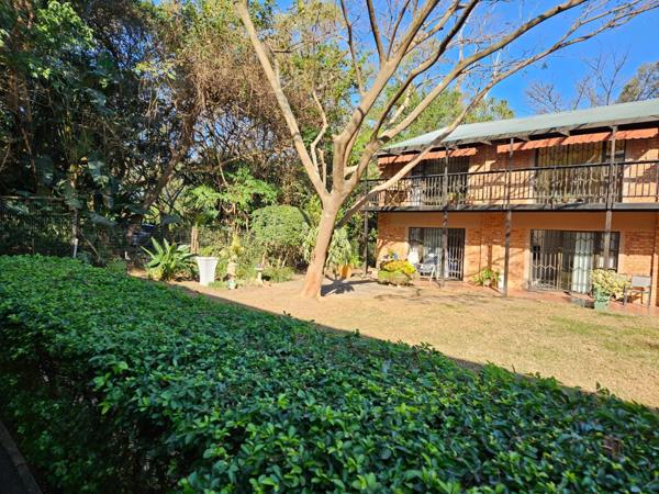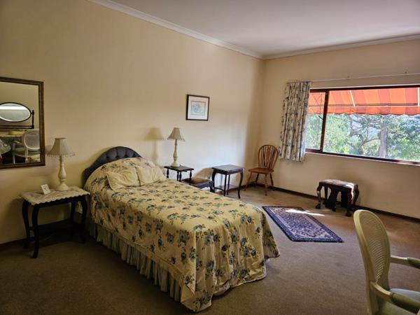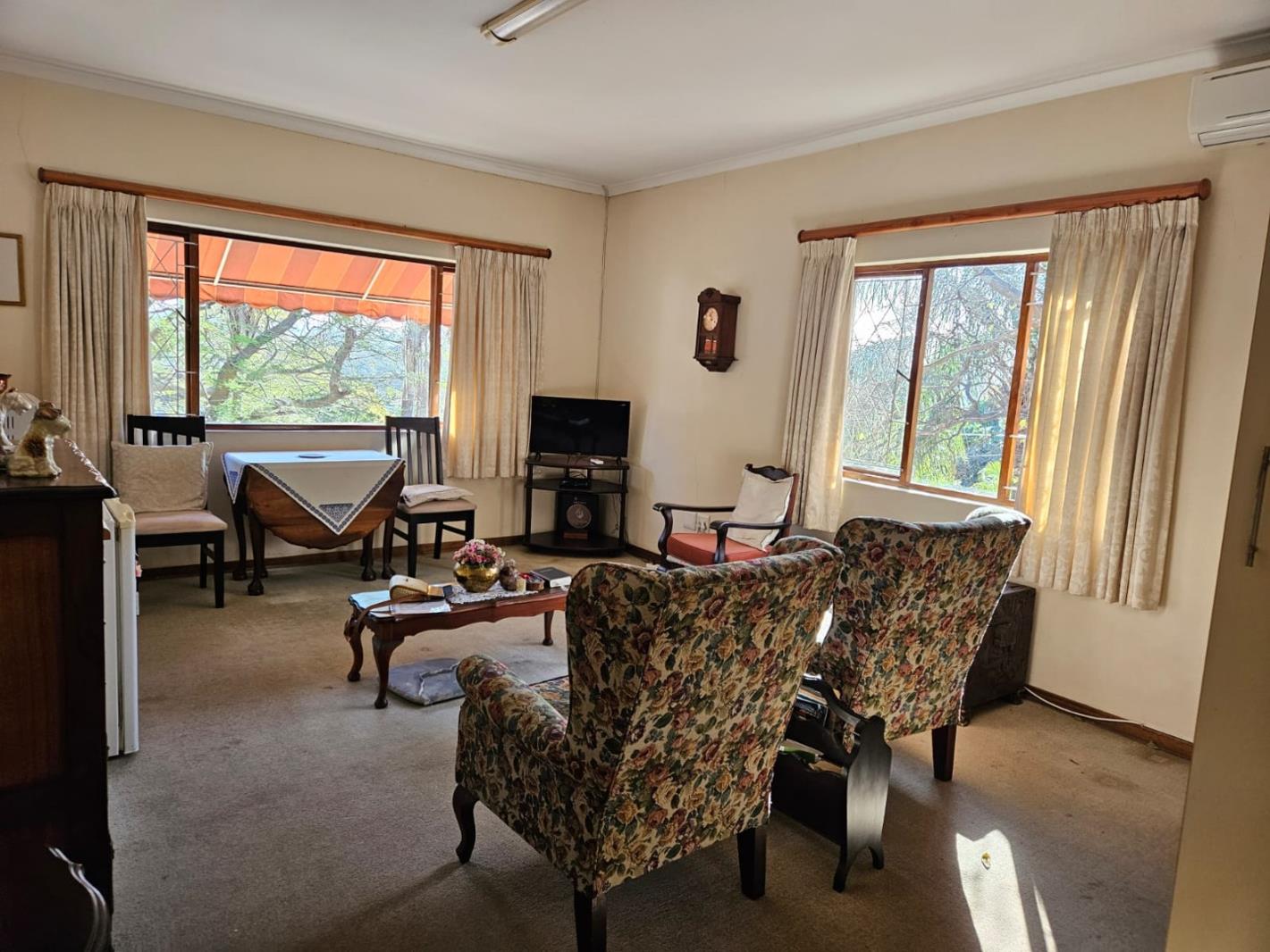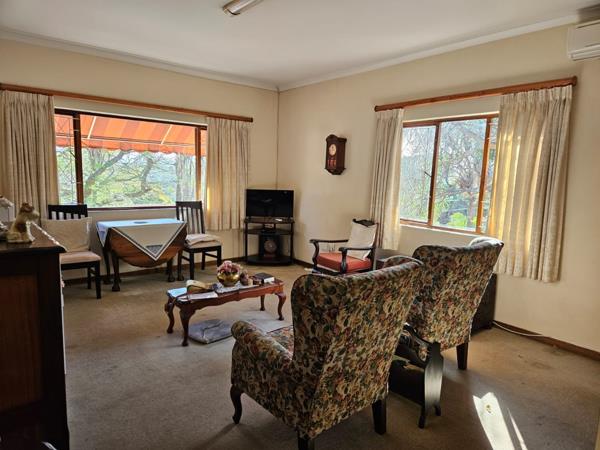 The interior features a welcoming lounge area, bathed in natural light from large windows that offer pleasant views of the surrounding greenery. While maintaining a traditional aesthetic, the space is functional and includes an air conditioning unit for comfort and a kitchenette.