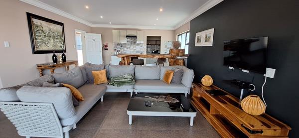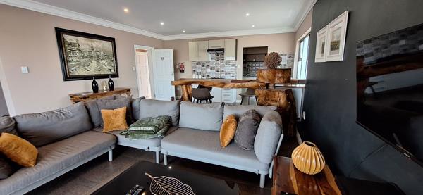 The open-plan living and dining areas flow seamlessly onto a covered veranda, providing the perfect setting to unwind while gazing at the ocean.