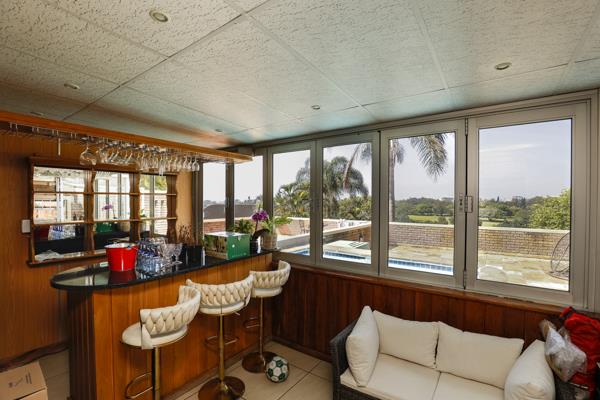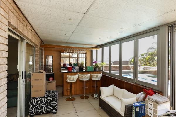 Entertainers paradise: Slide open the doors to a covered patio with built-in bar, leading to a generous outdoor space with a sparkling pool and wood-fired pizza oven perfect for weekend braais, sunset cocktails, or family fun under the stars.
