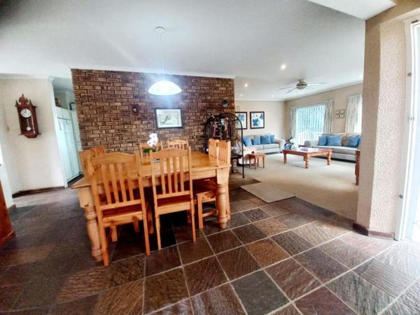 Large entertainment room leading out to the pool and lush garden with birdlife.