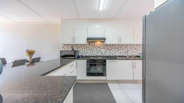 The interior boasts a well-designed, contemporary space, finished with tiling throughout. The open-plan lounge and dining area forms the heart of the home, offering seamless access to a private garden area equipped with a built-in braai, perfect for outdoor entertaining.